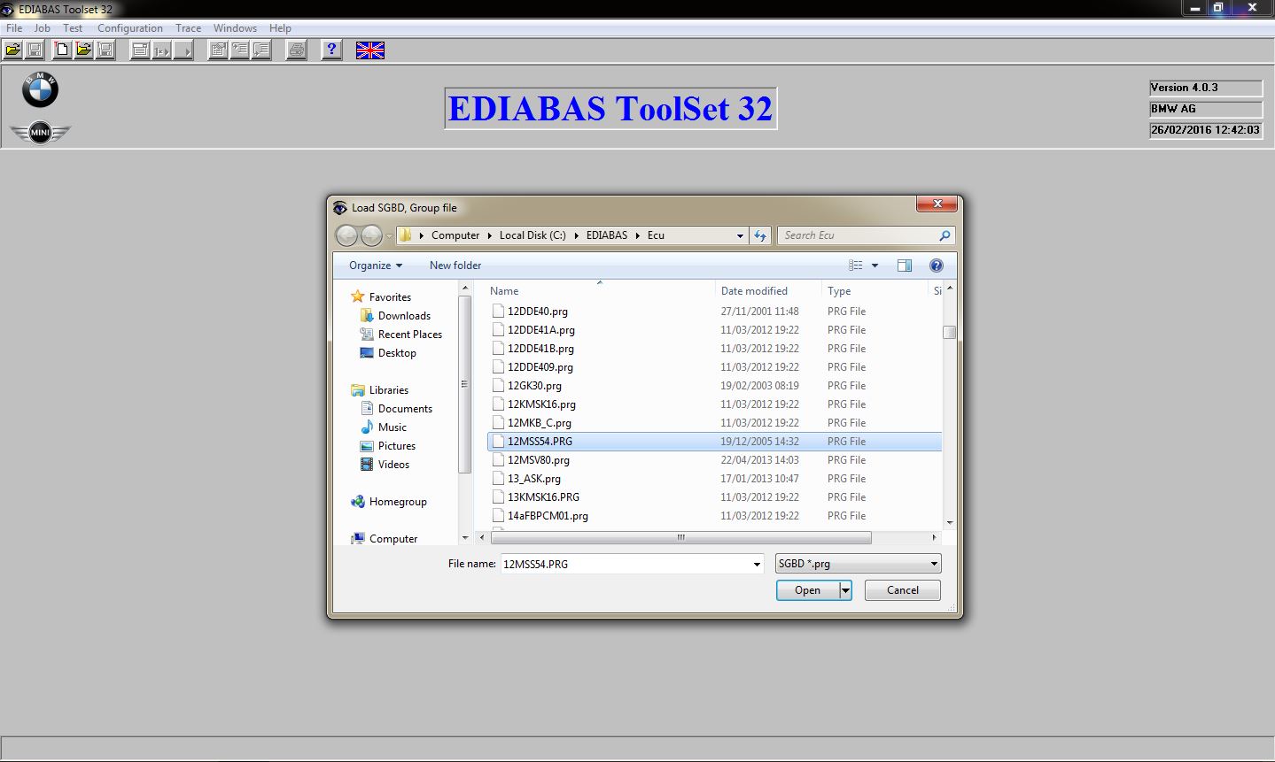 - Click ‘File’ > ‘Load SGBD, Group File’ and browse to the ‘C:\Ediabas\ECU\12MSS54.PRG’ file and click ‘Open’