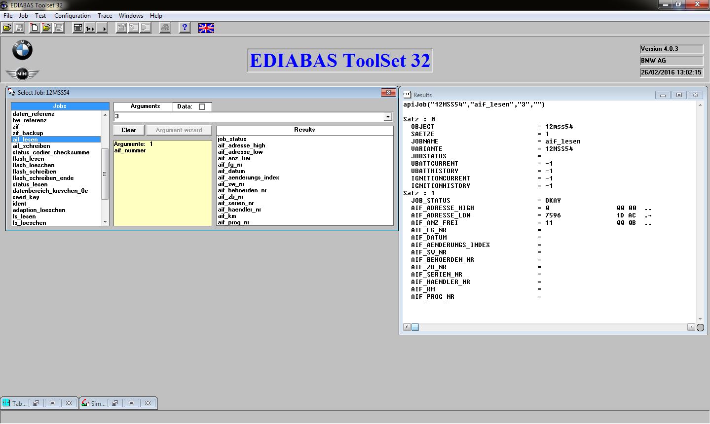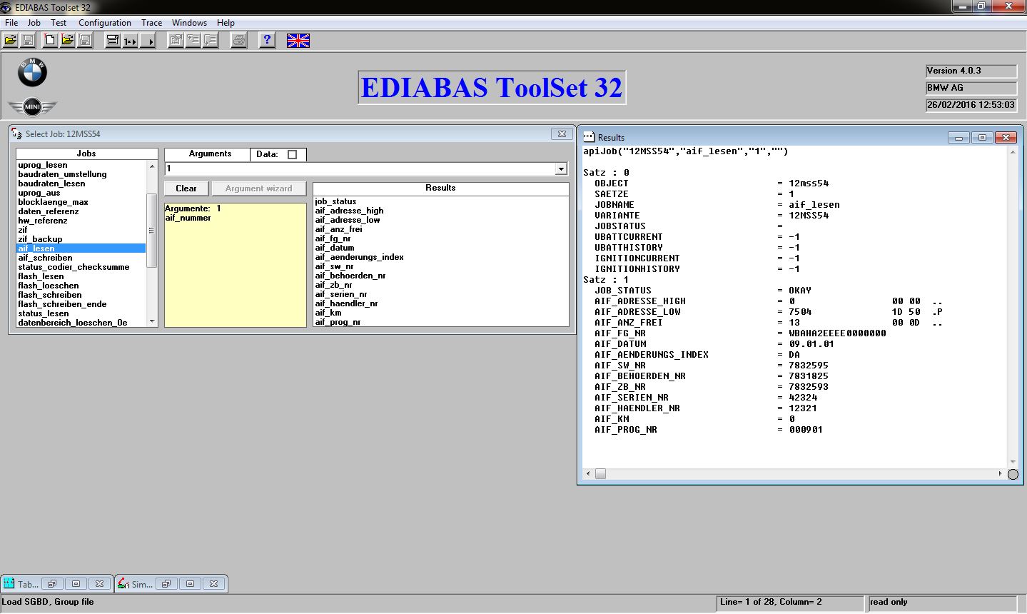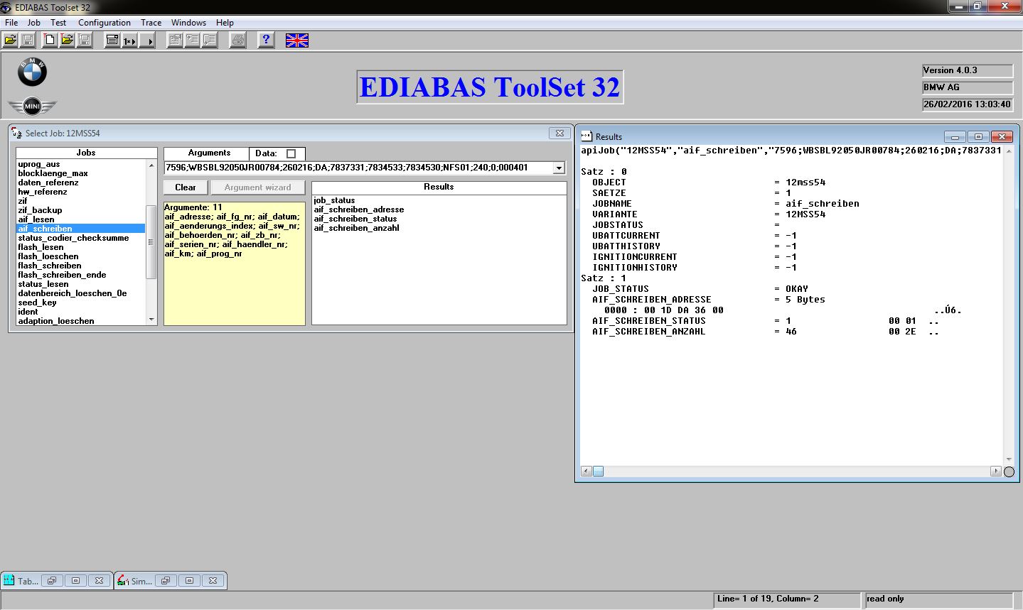 - In the ‘Jobs’ list double click ‘aif_lesen’. The results window should return a ‘Job_Status’ of ‘OKAY’ and the first VIN programmed into the DME will be displayed along with other AIF data